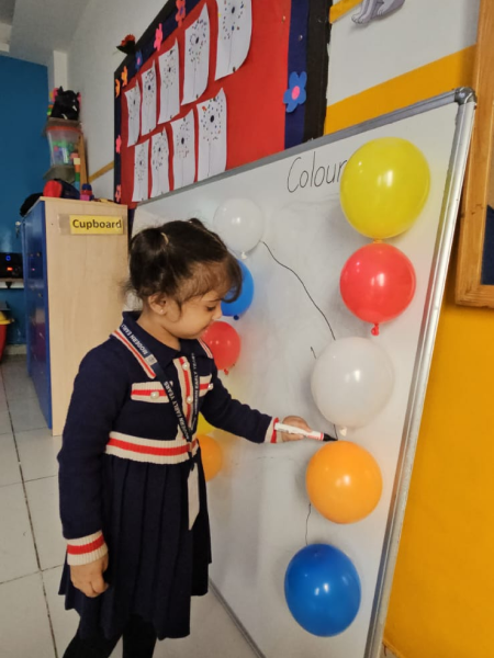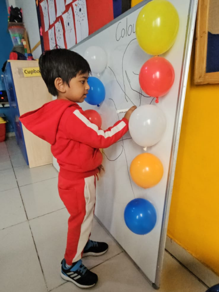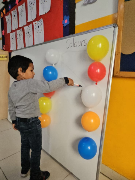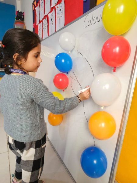 In the Pre-Nursery class at Modern Ealy Years, Deepali we revisited the concept of colours through a simple yet effective activity. Students were tasked with matching balloons of the same colour pasted on the board. This hands-on exercise not only reinforced their ability to recognise colours but also encouraged interaction and engagement. As they eagerly identified and paired balloons of identical hues, students developed their cognitive skills and fine motor abilities. Through this playful approach, the class successfully reinforced the fundamental concept of colours in an enjoyable and interactive way.