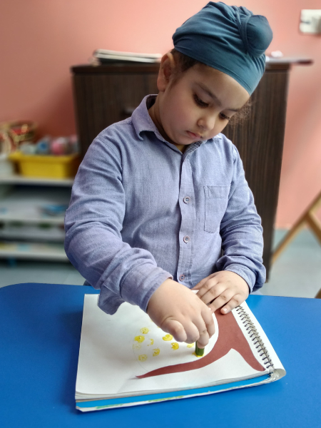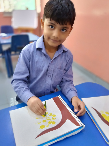 In the Lady Finger Painting Activity conducted in Class KG, children explored their creativity by using lady fingers to create beautiful tree designs. Each child dipped the lady fingers in the paint and stamped them onto paper, forming colourful leaves on their trees. This fun and interactive activity allowed the children to develop their artistic skills while learning about nature and the changing seasons. The classroom was filled with laughter and creativity as each student proudly showcased their unique tree creations, highlighting their imagination and artistic expression.