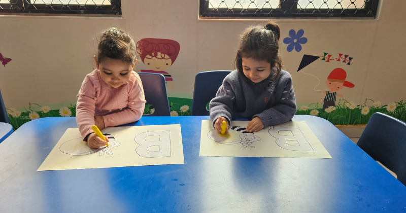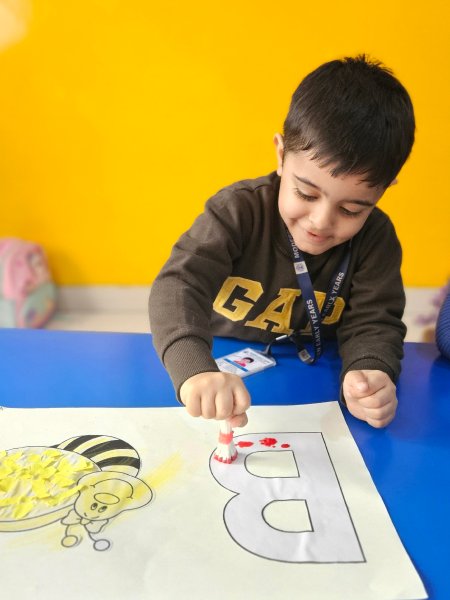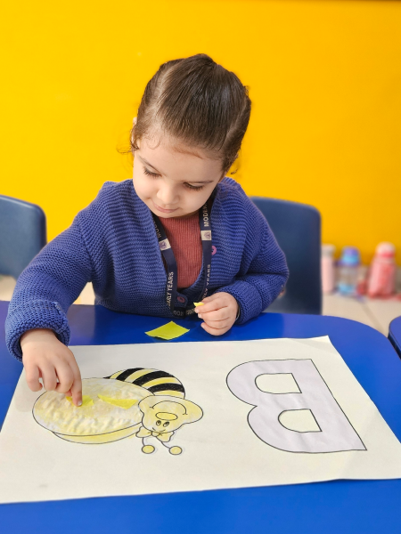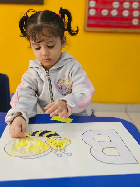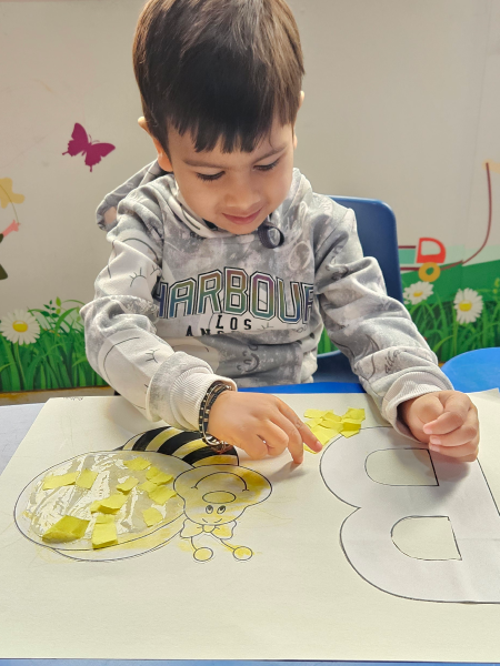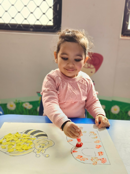 In pre-nursery class at Modern Early Years, Deepali, children learned to recognize the letter B through a fun tearing and pasting activity. They were provided with pictures of bees and tasked with tearing and pasting yellow paper to complete the image. This interactive activity not only reinforced their understanding of the letter B but also enhanced their fine motor skills. The children thoroughly enjoyed the hands-on experience while learning about letters in an engaging way!