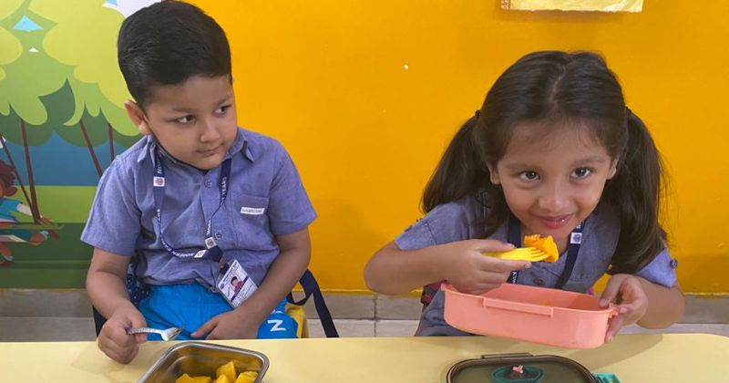 During the fruit break time, children shared and relished various varieties of mangoes they had brought as special tiffins.