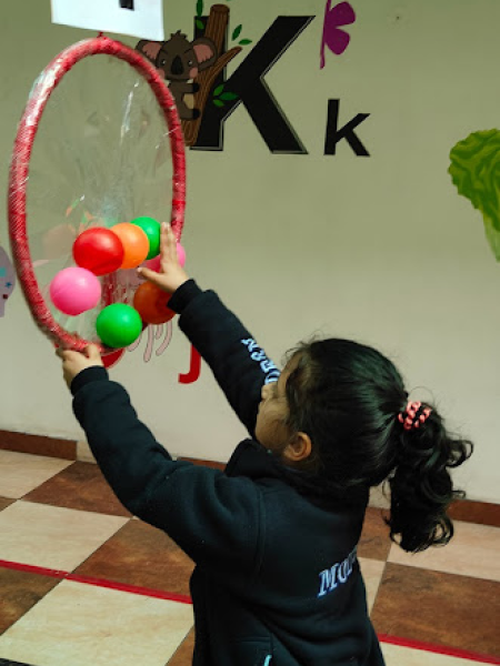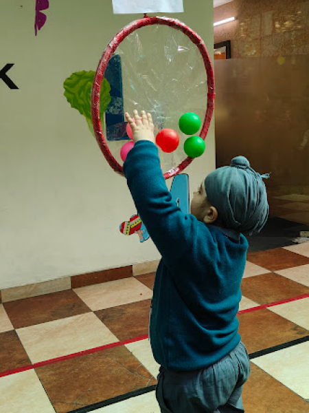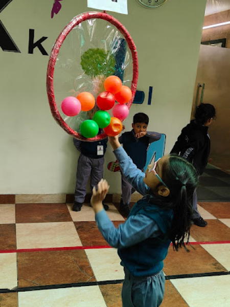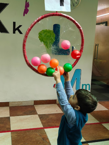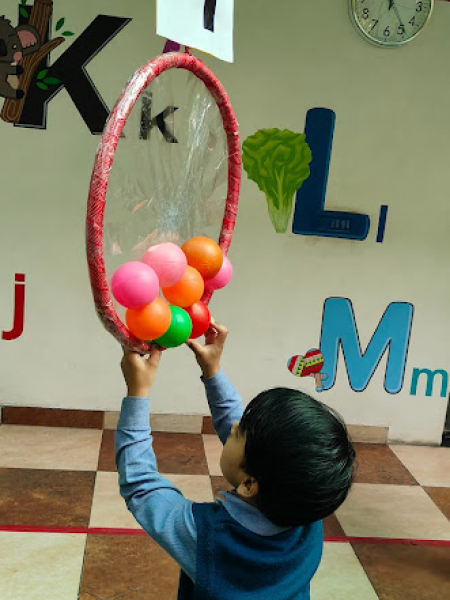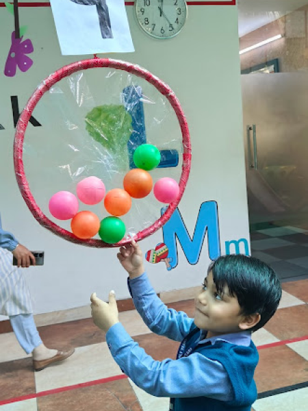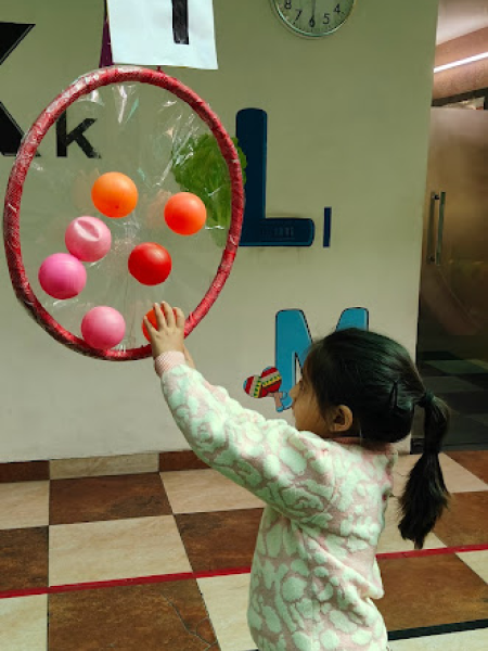 In the nursery class, we revisited the lesson on number 9 by introducing a delightful and interactive activity. Students were tasked with throwing balls onto a hula hoop adorned with tape segments. Their objective was to skillfully toss the balls in a manner that would result in nine of them adhering to the hoop's surface. This engaging activity not only reinforced the concept of the numeral 9 but also enhanced the students' hand-eye coordination, problem-solving skills, and collaborative spirit. Through this playful approach, the students enthusiastically embraced the concept of number 9, making learning both memorable and enjoyable.