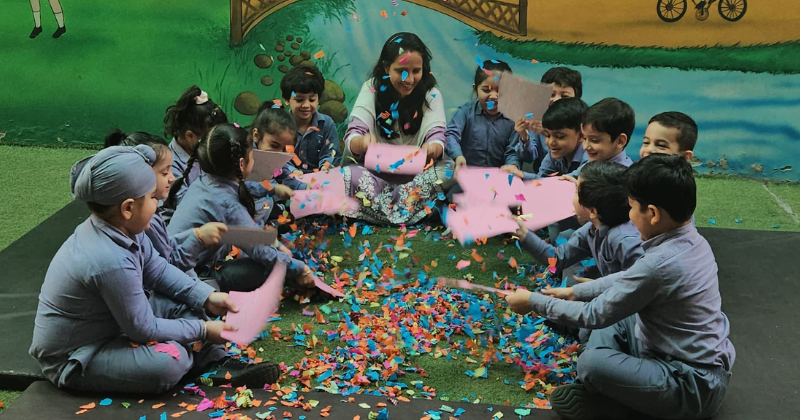In class KG, a fun-filled activity took place where the children flew paper cutouts, much like confetti. The little ones had a delightful time, joyfully watching the colourful pieces flutter through the air.