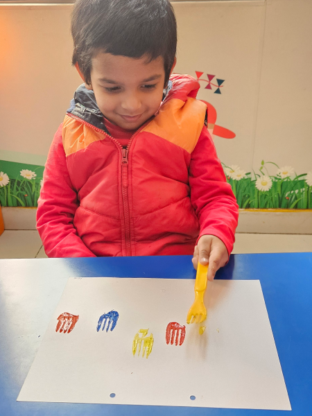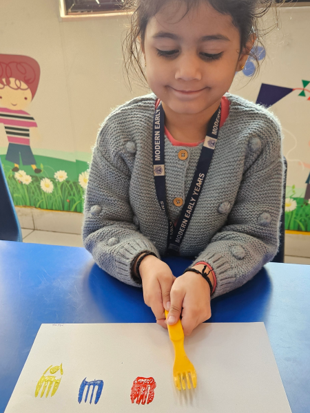 In the Pre-Nursery class of Modern Early Years,Deepali students enthusiastically participated in a flower printing activity aligned with our spring season theme. Using forks as their tools, they learned to create charming flowers by dipping the utensil tines into various shades of paint and pressing them onto paper. This hands-on experience not only encouraged creativity and fine motor skills but also nurtured an appreciation for the beauty of flowers and the changing seasons. Overall, the activity provided a delightful and educational exploration of art and nature for our students.