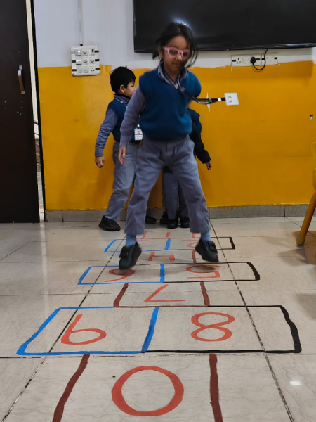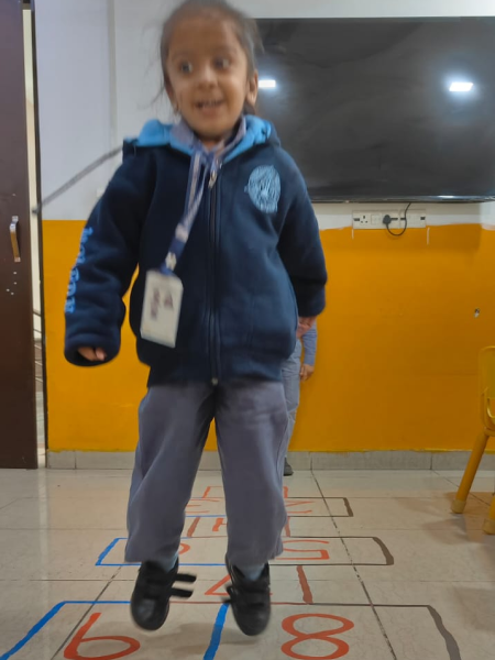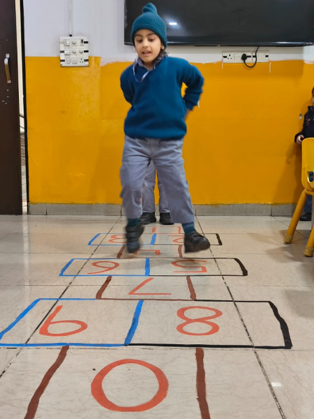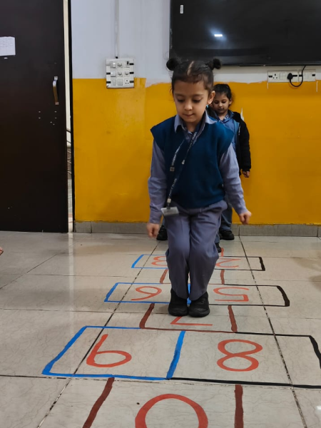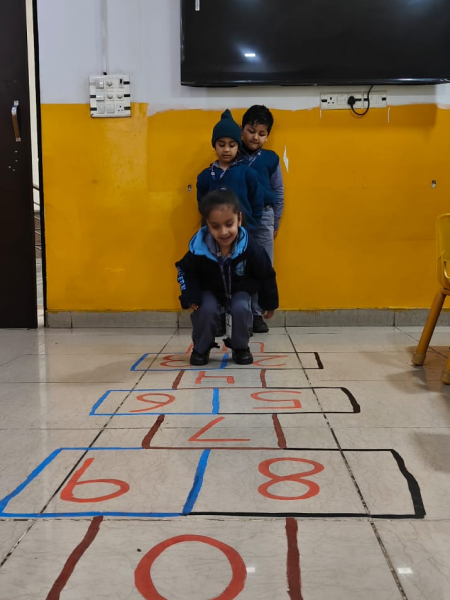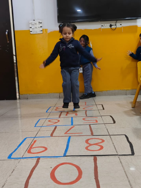 In the nursery class, the students of Modern Early Years, Deepali engaged in an interactive hopscotch activity to recapitulate numbers 1 to 9. The purpose of the activity was to reinforce their understanding of numerical sequencing playfully. The children eagerly participated in the hopscotch game, taking turns hopping from one numbered square to another while reciting the numbers aloud. This hands-on approach helped solidify their recognition and comprehension of the numeric sequence.