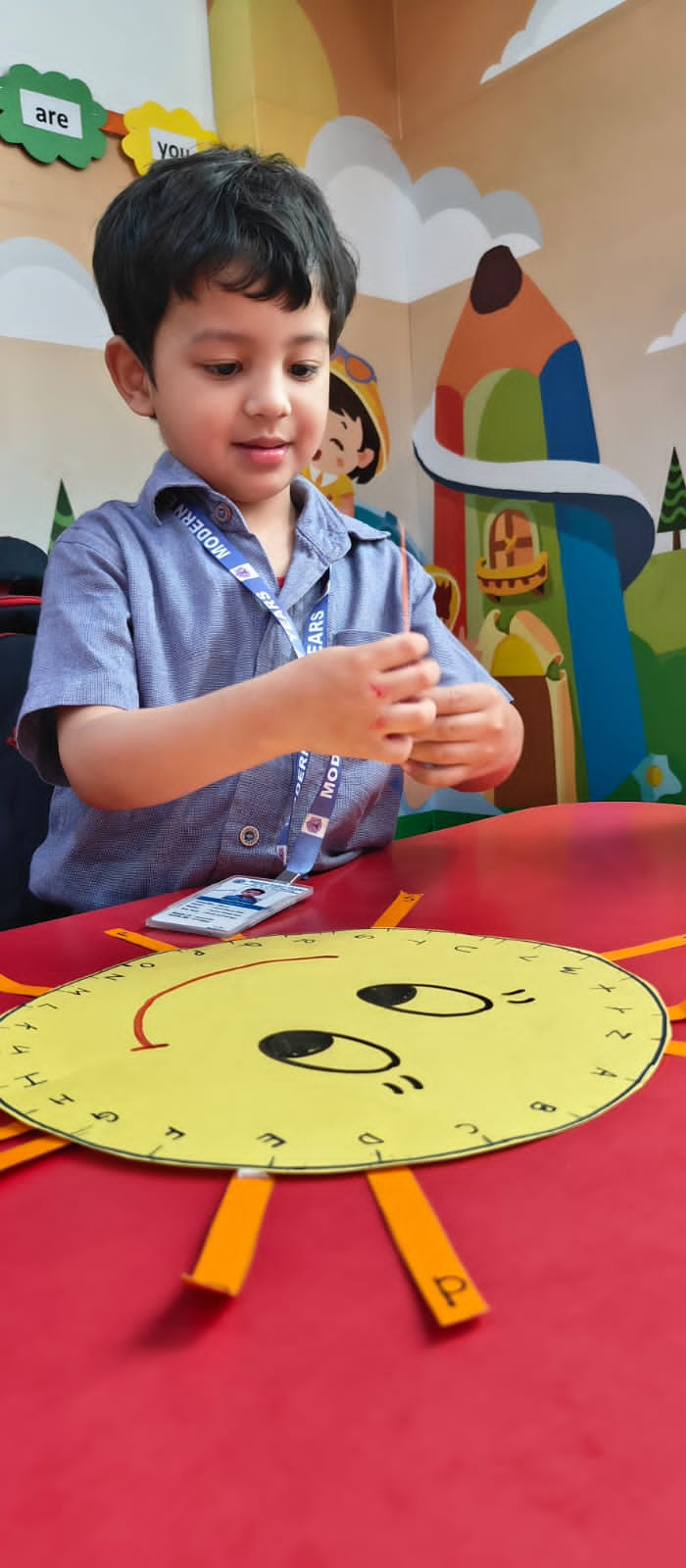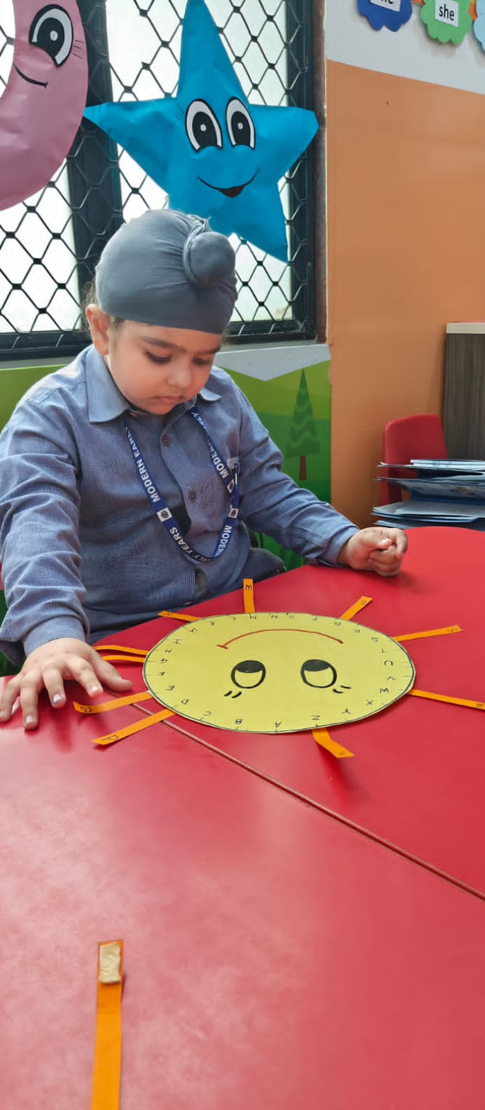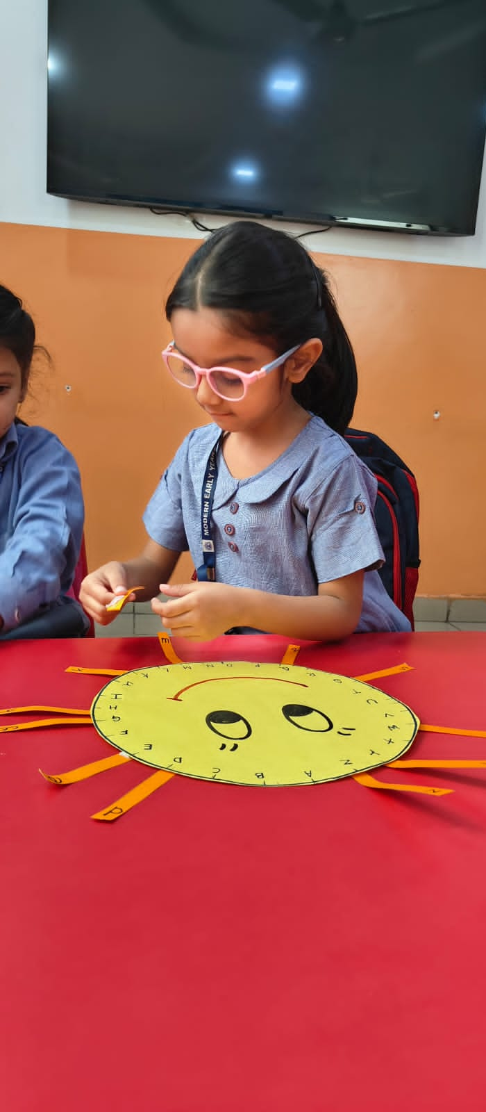 In KG class, students were asked to match the rays of the sun with small letters written on them. They were encouraged to pay attention to the capital letters on the sun and match them with the corresponding small letters on the rays. This activity aimed to reinforce letter recognition skills in a fun and engaging way.