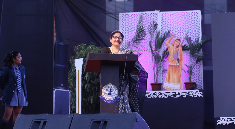 The event commenced with the lighting of the lamp and invocation of Goddess Saraswati through chanting of ‘Saraswati Vandana’, followed by the warm welcome extended by the Principal, Ms. Abha Sadana who presented the Annual School Report along with senior students, Sauhard Sharma and Diya Jain, highlighting the accomplishments of the students in the past year.
