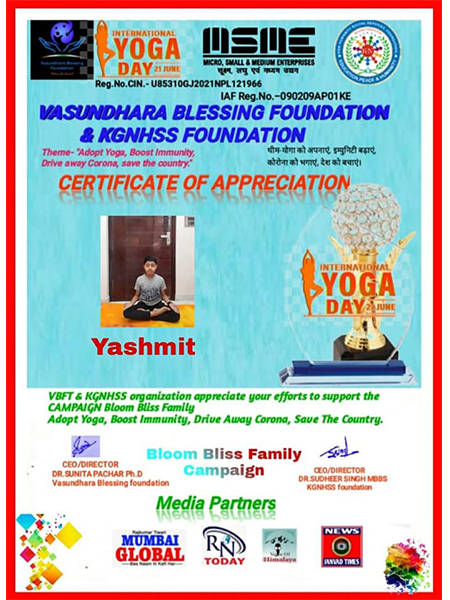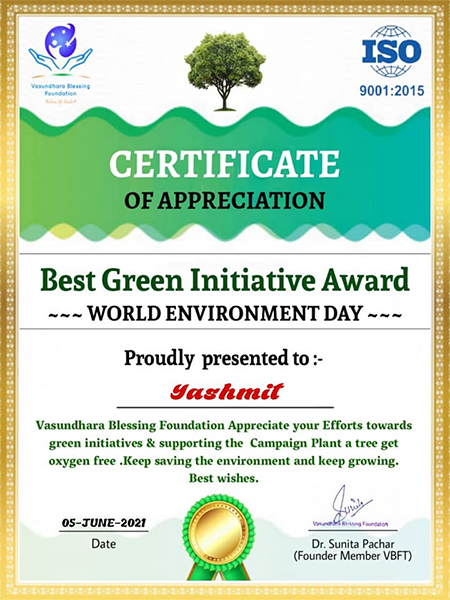 “Get lost in nature and meditation and you will find yourself.” With the motivation of the teachers and under the able guidance of the instructors, the inspiring Yoga follower and lover of green environment, Yashmit Chawla, student of P5 B participated in two campaigns organized by Vasundhra Blessing Foundation, an organization serving to create and carry out awareness on Swatch Bharat, tree plantation, clean drinking water etc.He bagged the Best Green Initiative Award and Certificate of Appreciation for his valuable contributions and participation in both the campaigns.