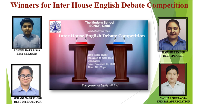 Debate competition extends an opportunity for students to structure as well as organise their thoughts on a topic and express confidently. It enables them to state their opinion and ideas thus strengthening language skills. Modernities from classes S4 and S6 participated in an Inter House English Debate Competition on December 14, 2021 expressing themselves on the topic ‘Does online education do more good than harm?’. The competition acknowledged the participants' drive to learn and compete during these challenging times. The participants expressed themselves confidently and eloquently. The online competition’s experience guided the participants to enhance their oratory skills and expressions.Â