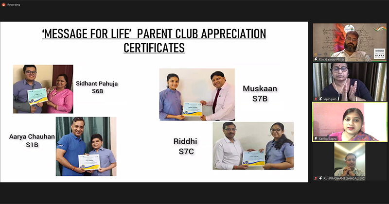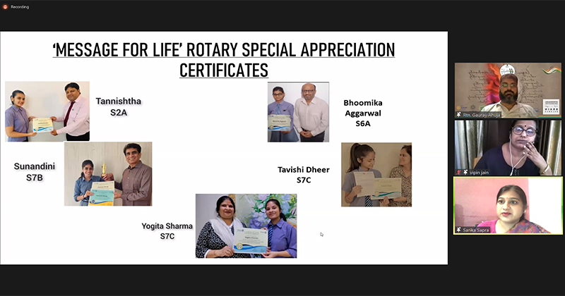 She emphasized the fact that it is an individual that defines a post and urged them to embrace their duties with humility, perseverance and loyalty.The Rotary Appreciation awards and appreciation certificates for the Project 'Message For Life' were also presented to the conscientious team members. Rotarian Prashant Sehgal, District Interact Chair (2021-22) accentuated that the will to help people around oneself cannot be deterred by anything, even a pandemic. So, one must be determined to serve society. The event concluded with the vote of thanks proposed by Ms.Anita, the Interact Club Advisor.