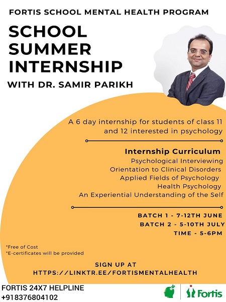 Psychology students of class S7 attended an internship programme from May 17, 2021 to July 10, 2021 conducted by Fortis Team, Shalimar Bagh, New Delhi on various topics like Bully to Buddy, Art Therapy, Summer Internship Programme, Pro Social Peer Moderator, Psycho-onology, Fashion Psychology, Sports Psychology and Clinical Psychology.
