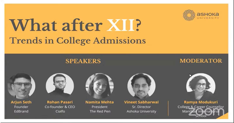 The webinar was moderated by Ramya Madukari along with a panel of experts-Namita Mehta, Vineet Sabharwal, Rohan Pasari and Arjun Seth. During the course of the webinar, various issues related to college admissions were taken up. The panel structured the discussions around three broad topics; impact of the pandemic on admissions for higher education, choices available for students in India and abroad and the significance of liberal education.