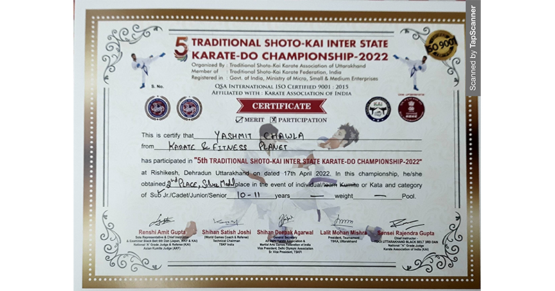 Self defence, self confidence, discipline and self control are some of the values instilled in the students through various extracurricular activities taught in the school. Our shining star, Yashmit Chawla of class VI, has made its alma mater proud by winning in the 5th Traditional Shoto Kai Inter State Karate Do Championship 2022 held in Rishikesh, Uttrakhand from 16th April 2022 to 18th April 2022. Yashmit has secured 1st position, Gold Medal in the 10 - 11 years Sub Junior category of Kumite event and 2nd position, Silver medal in the 10 - 11 years Sub Junior category of Kata event.
