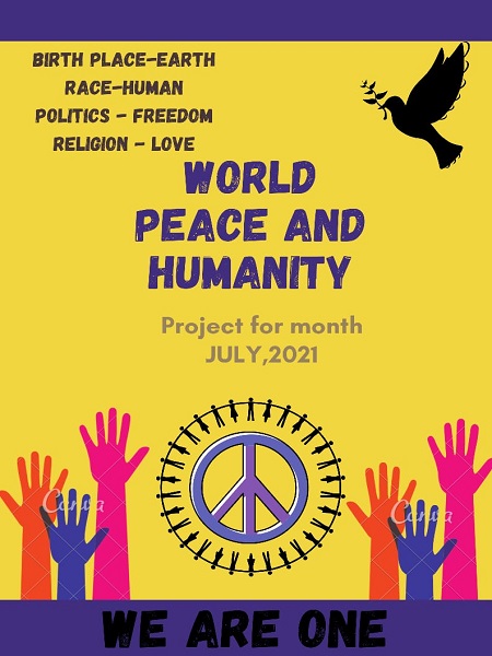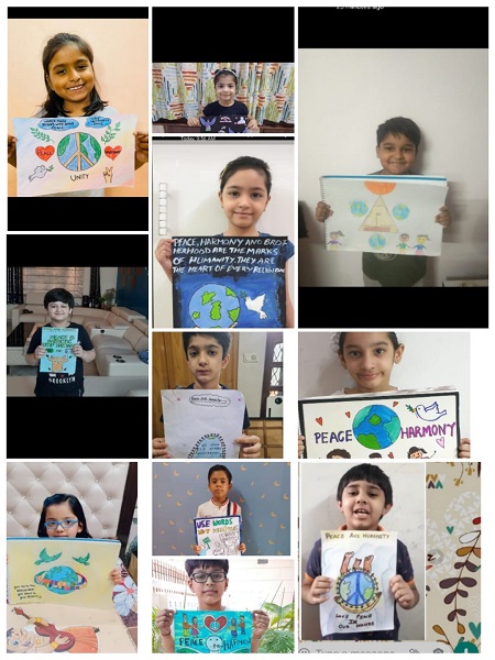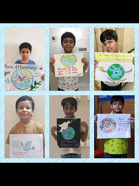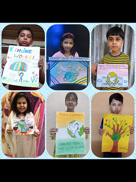 To help the students understand the importance of maintaining peace in the world and following the global religion of humanity for coexistence and eternal bliss, the school observed World Peace and Humanity as the theme of the month in both the Primary and Senior Wing.An Art Integrated English Extempore Activity on the theme "Peace and Humanity" was organized on July 17, 2021 for the students of classes P3-P5. They prepared a poster based on the theme , using their creativity and imagination. They also expressed their vision of spreading peace and humanity in the world, by exhibiting the poster and speaking eloquently on the topic. The tiny tots of the pre primary wing indulged in discussing on the topic ‘ Peace’ during a special assembly. They showcased their comprehension of the word in various forms of art.